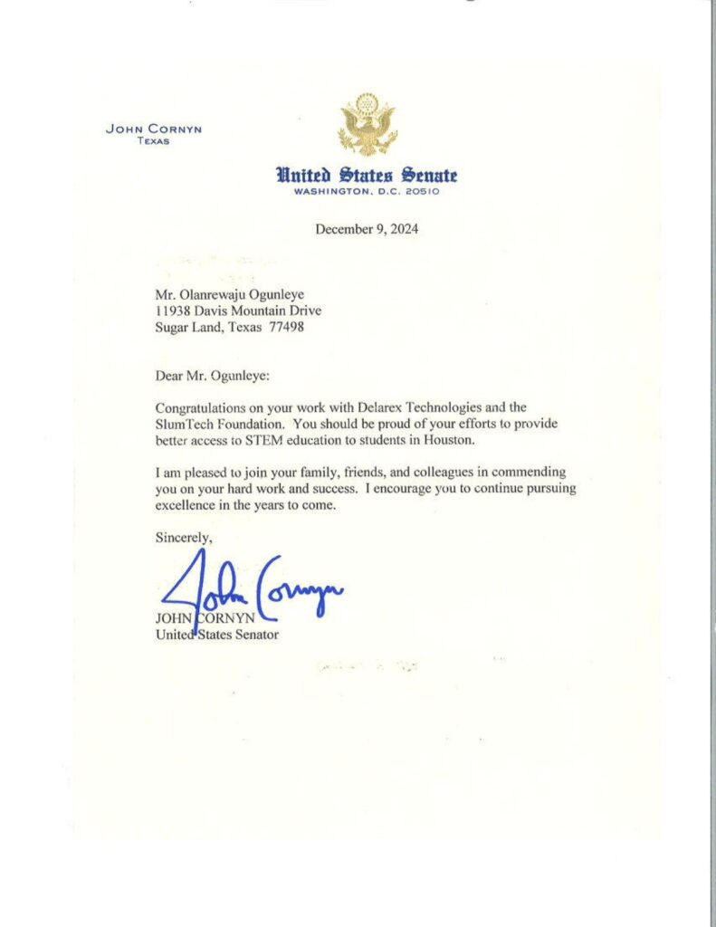 In addition to his corporate achievements, Olanrewaju is deeply passionate about giving back to the community. Through the SlumTech Foundation, he has made significant strides in promoting STEM (Science, Technology, Engineering, and Mathematics) education in Houston, TX high schools. His efforts have been recognized by US Senator John Cornyn, highlighting the impact of his work in empowering the next generation of tech leaders.